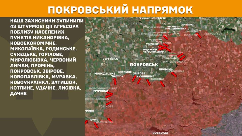 На Покровском направлении за прошедшие сутки наши защитники остановили 43 штурмовых действия агрессора вблизи населенных пунктов Никаноровка, Новоэкономическое, Николаевка, Родинское, Сухецкое, Орехово, Миролюбовка, Красный Лиман, Луч, Покровск, Зверевое, Новопавловка, Муравка, Новоуловка Лисовка, Дачное.