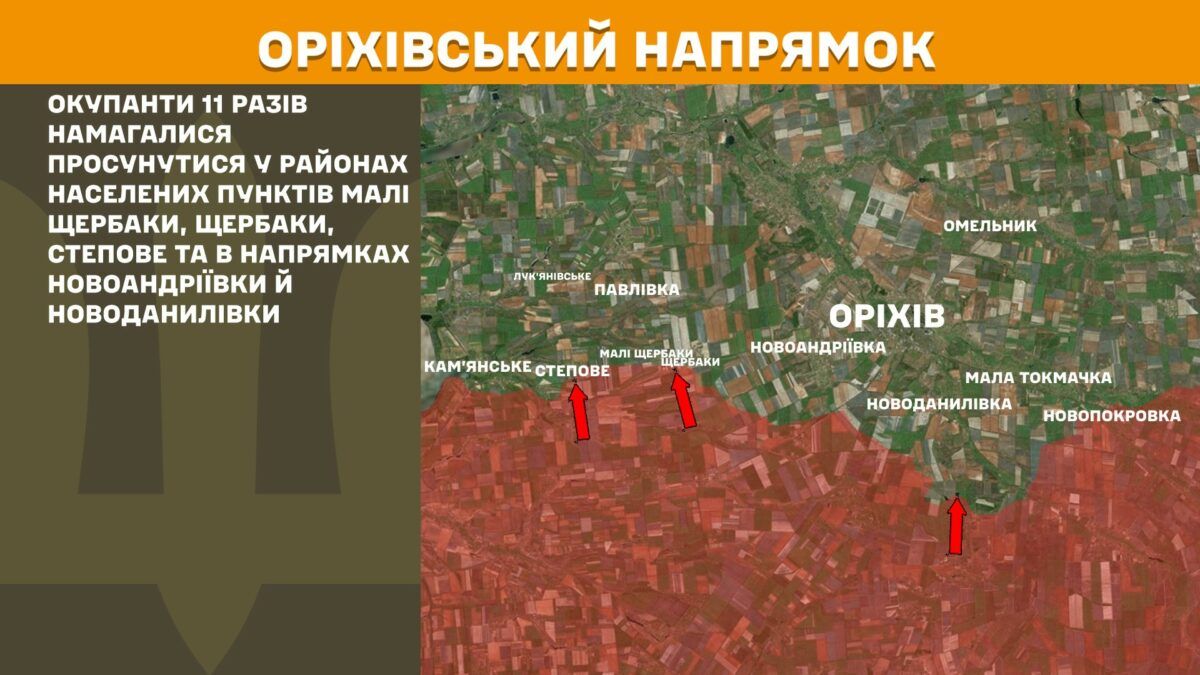 На Ореховском направлении оккупанты 11 раз пытались продвинуться в районах населенных пунктов Малые Щербаки, Щербаки, Степное и в направлениях Новоандреевки и Новоданиловки.