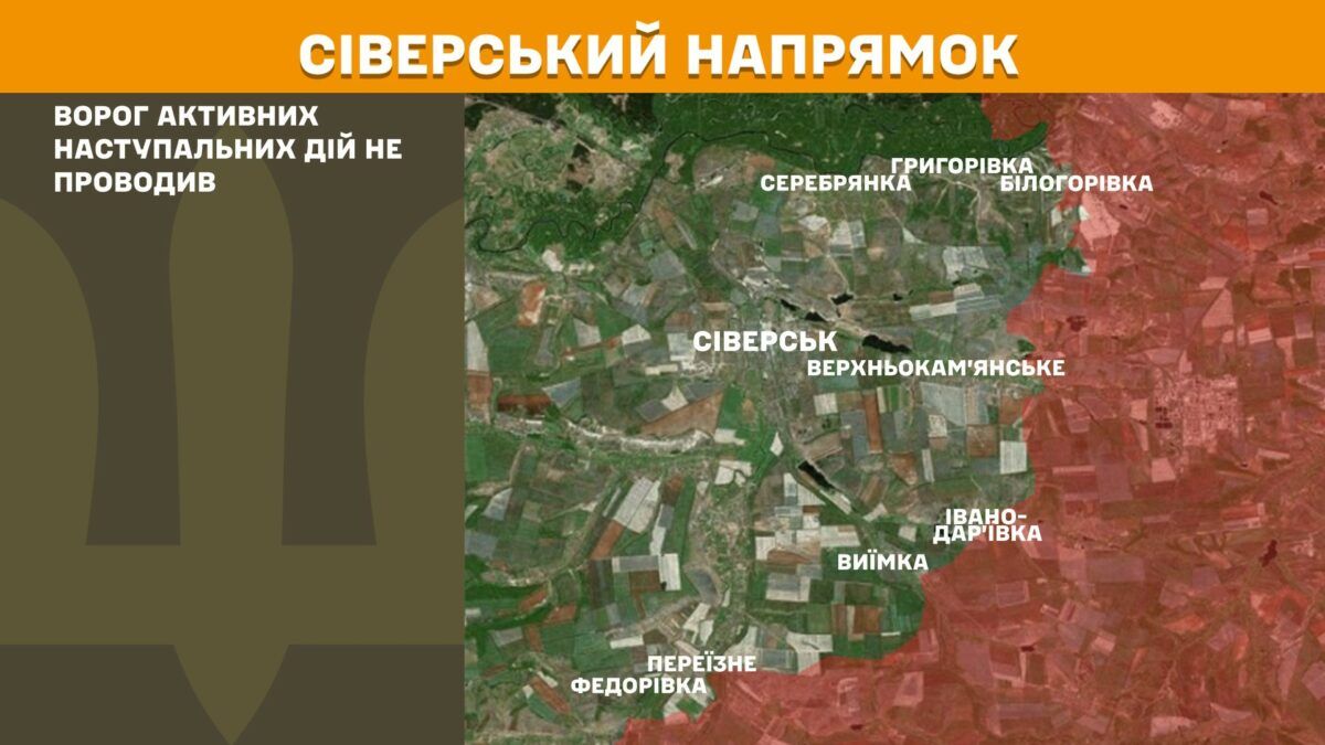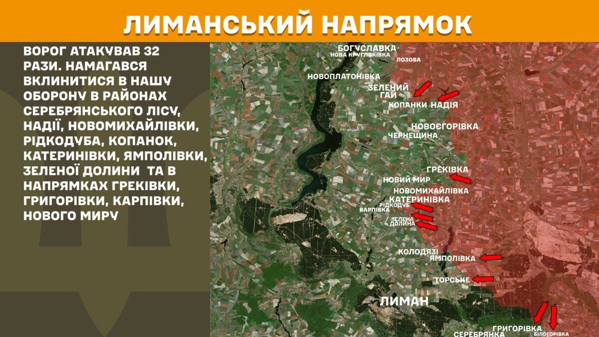 На Лиманском направлении враг атаковал 32 раза. Пытался вклиниться в нашу оборону в районах Серебрянского леса, Надежды, Новомихайловки, Редкодуба, Копанок, Екатериновки, Ямполевки, Зеленой Долины и в направлениях Грековки, Григоровки, Карповки, Нового Мира.