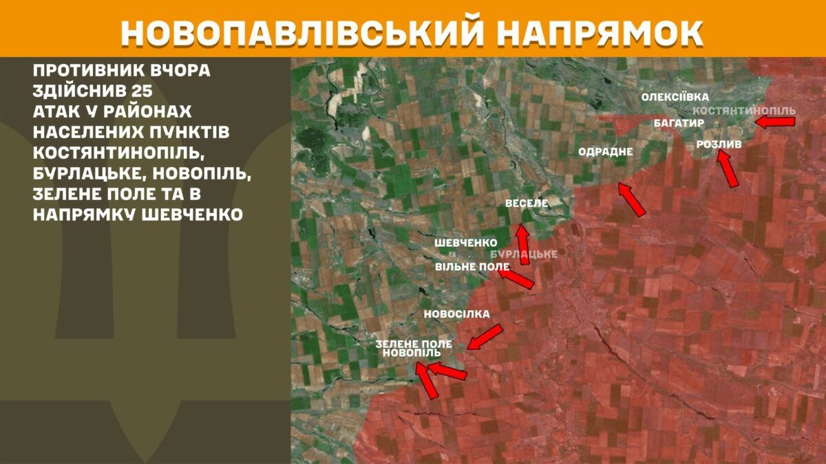 На Новопавловском направлении противник вчера совершил 25 атак в районах населенных пунктов Константинополь, Бурлацкое, Новополье, Зеленое Поле и в направлении Шевченко.