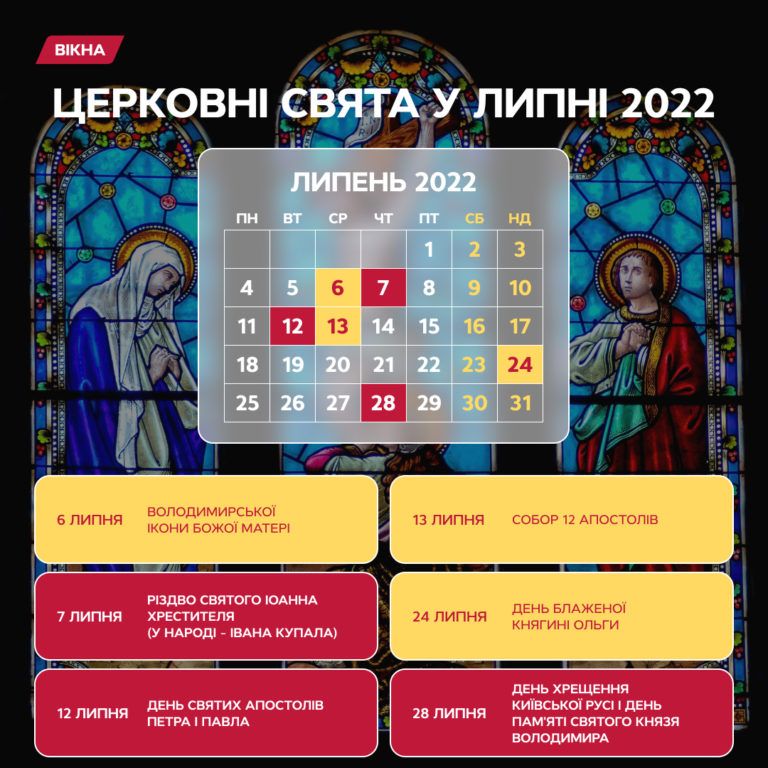 У липні 2022 року християни східного обряду в Україні відзначають кілька церковних свят. Наприклад, Різдво Святого Іоанна (в народі Івана Купала), день святих апостолів Петра і Павла, День хрещення Київської Русі та день пам’яті Святого князя Володимира.