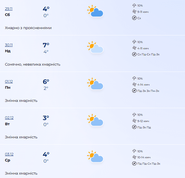 На вихідних, 29 та 30 листопада, та на початку грудня, 1-3 грудня, погода буде вже прохолоднішою: денні температури коливатимуться від 3°С до 7°С, а нічні – близько нуля. Хмарність буде змінною, але опадів поки не передбачається, вітер – легкий.