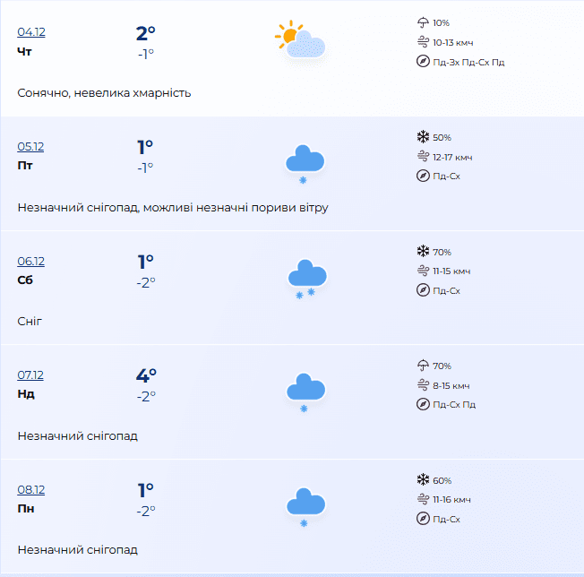 Вітер посилиться, 6 грудня снігопад стане більш помітним, ймовірність його сягає 70%, температура вдень – лише 1°С, вночі – -2°С.