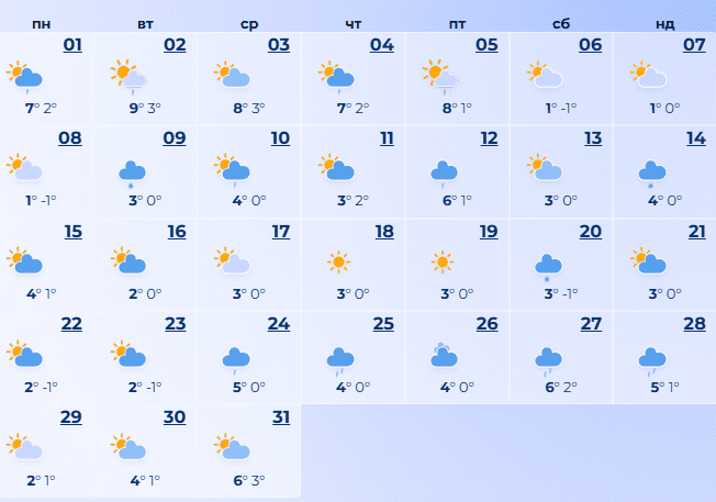 Місяць починається тепло, наче осінь затрималася: удень 7-9°С, потім трохи прохолодніше (8–1°С). Перші дні — з дощем, інколи навіть коли світить сонце. Поступово погода заспокоюється, і до вихідних стає тихо, сухо та прохолодно: вдень лише 1°С, уночі 0…-1°С.