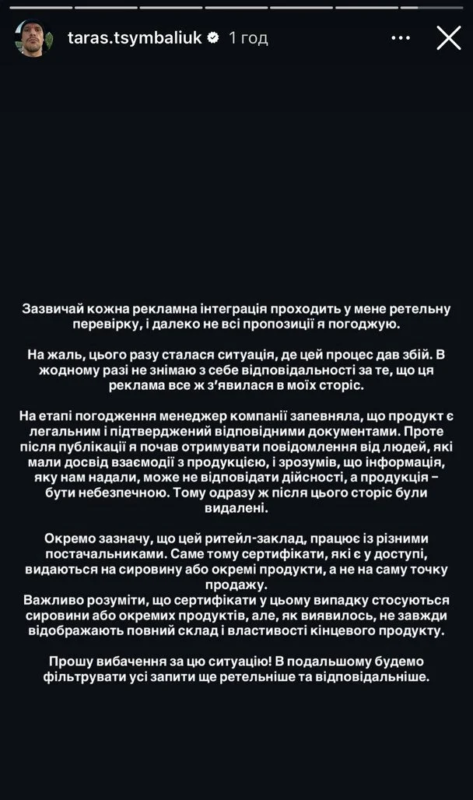 — Кожна рекламна інтеграція проходить у мене ретельну перевірку. На жаль, цього разу процес дав збій. На етапі погодження менеджер компанії запевняла, що продукт легальний і підтверджений відповідними документами. Після публікації я почав отримувати повідомлення від людей, які мали досвід взаємодії з продукцією, і зрозумів, що інформація, яку нам надали, може не відповідати дійсності, а продукція — бути небезпечною. Тому одразу ж після цього сторіз були видалені, — відверто прокоментував ситуацію Тарас Цимбалюк.