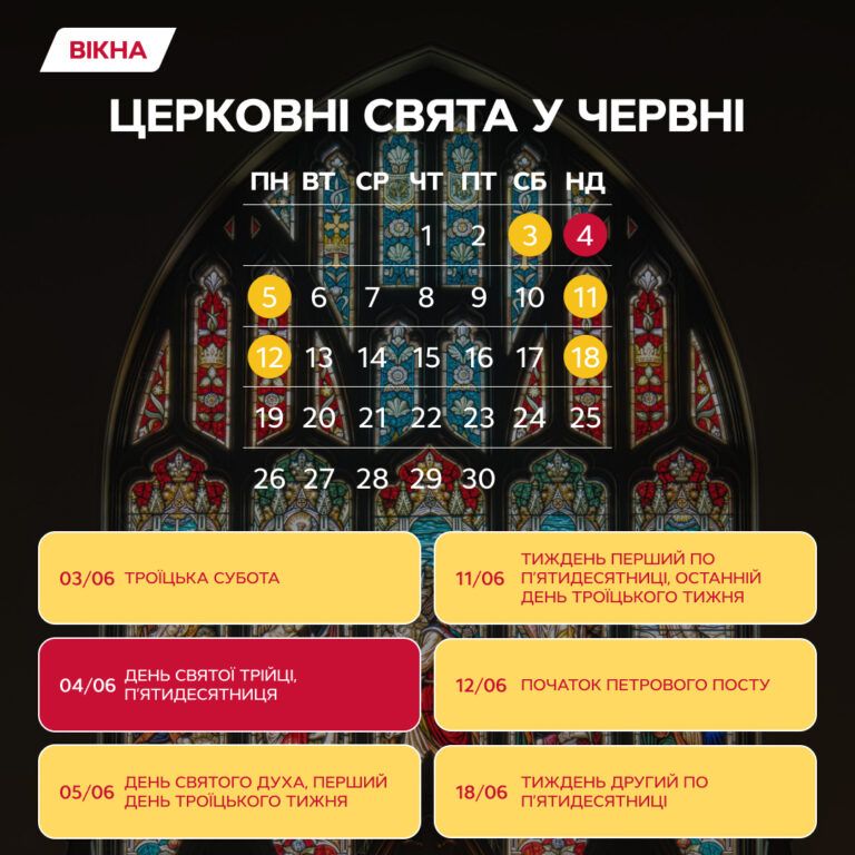 У червні на нас очікують небагато церковних свят. Наближається Трійця, тому половина з них присвячена саме їй. Також у червні розпочинається Петрів піст, тому будь уважним(-ою), якщо ти дотримуєшся постів.