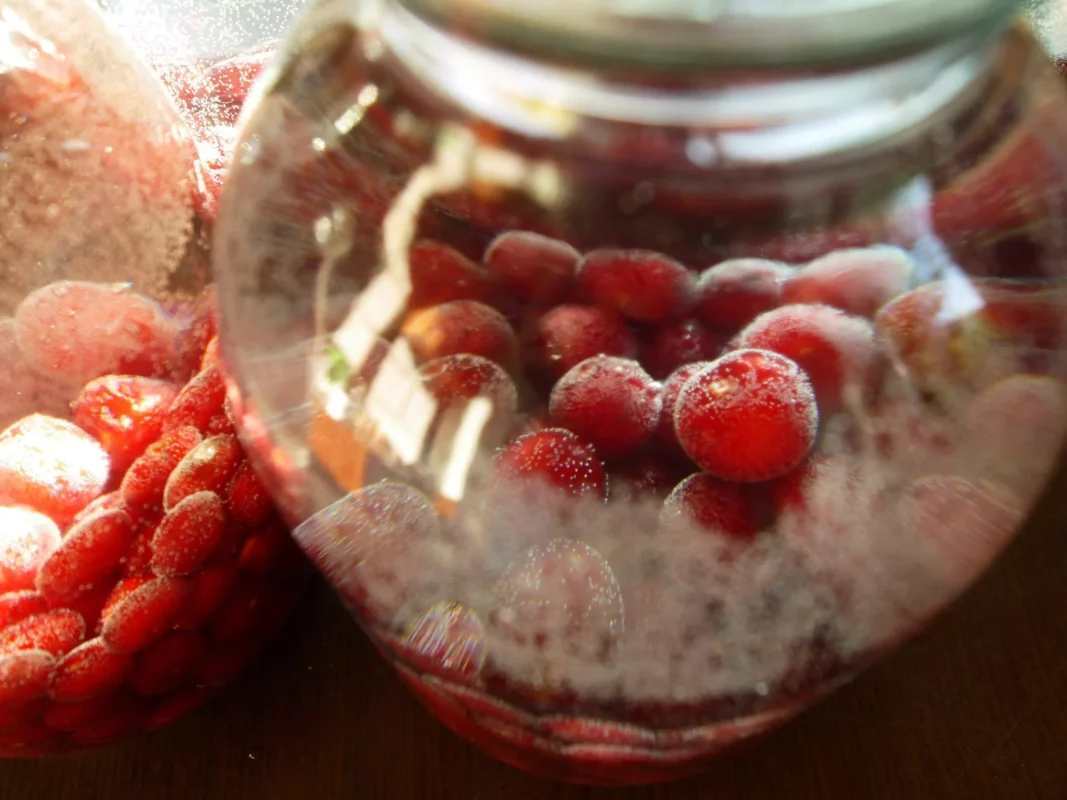 - Злити з ягід воду та наповнити ними простерилізовані трилітрові банки на 1/3 частини.
