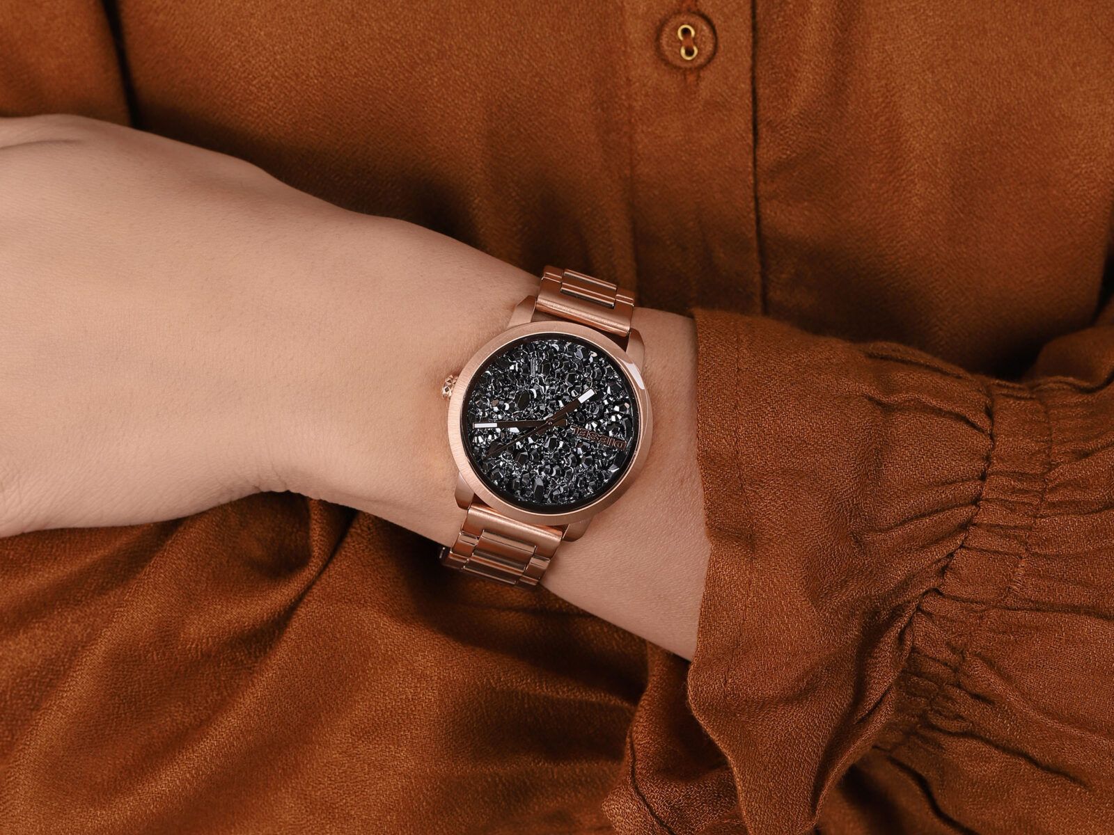 Корпус діаметром 38 мм виготовлений із нержавіючої сталі кольору рожевого золота. Головна особливість — циферблат із текстурою подрібненого каміння, що надає аксесуару унікальність та епатаж. Відтінок циферблата змінюється залежно від одягу та освітлення, тому годинник пасуватиме під будь-який стиль.