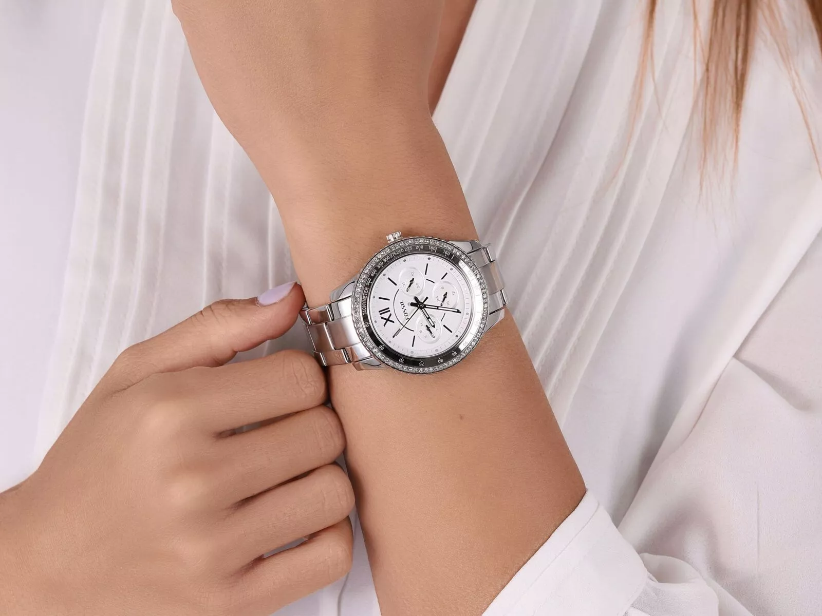 - Масивний безель, інкрустований кристалами, додає моделі розкішний та елегантний вигляд.