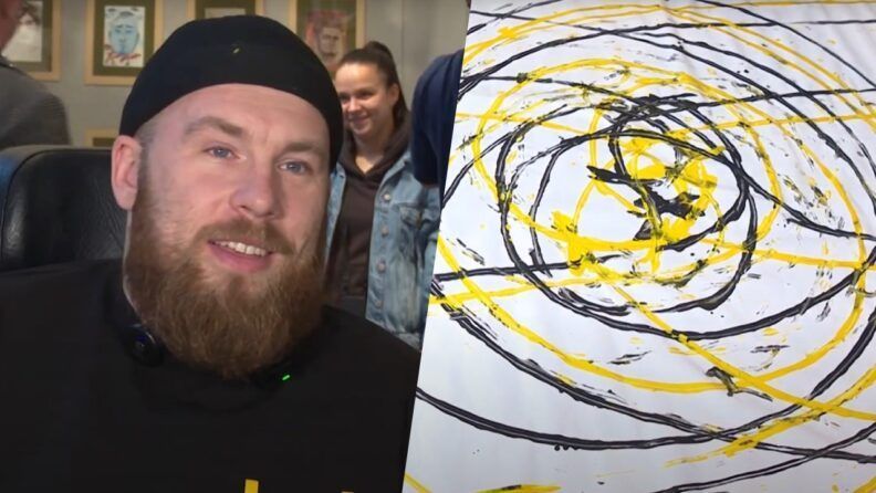 Захисник України Валентин Олексієнко, який не відчуває тіла нижче грудей, створив унікальну картину за допомогою крісла колісного. Це вже четверта його робота, одну з яких він подарує центру Незламні, а решту планує виставити на міжнародний аукціон, щоб зібрати кошти на реабілітацію побратимів.