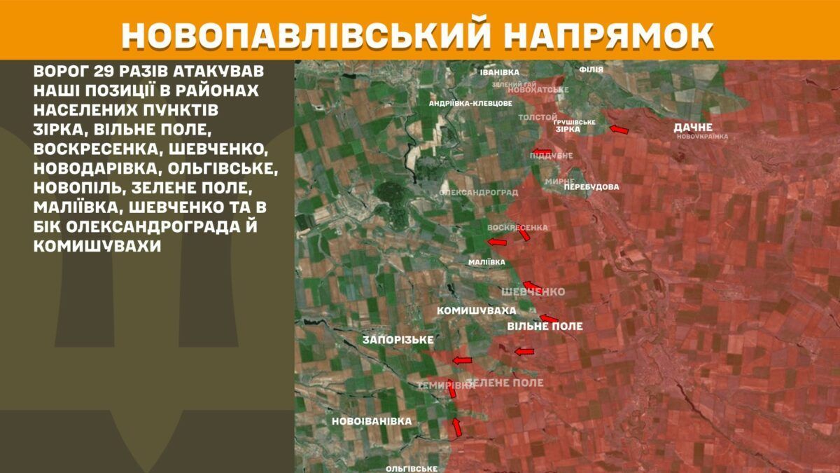 На Новопавлівському напрямку відбулося 29 атак в районах населених пунктів Зірка, Вільне Поле, Воскресенка, Шевченко, Новодарівка, Ольгівське, Новопіль, Зелене Поле, Маліївка, Шевченко та в бік Олександрограда й Комишувахи.