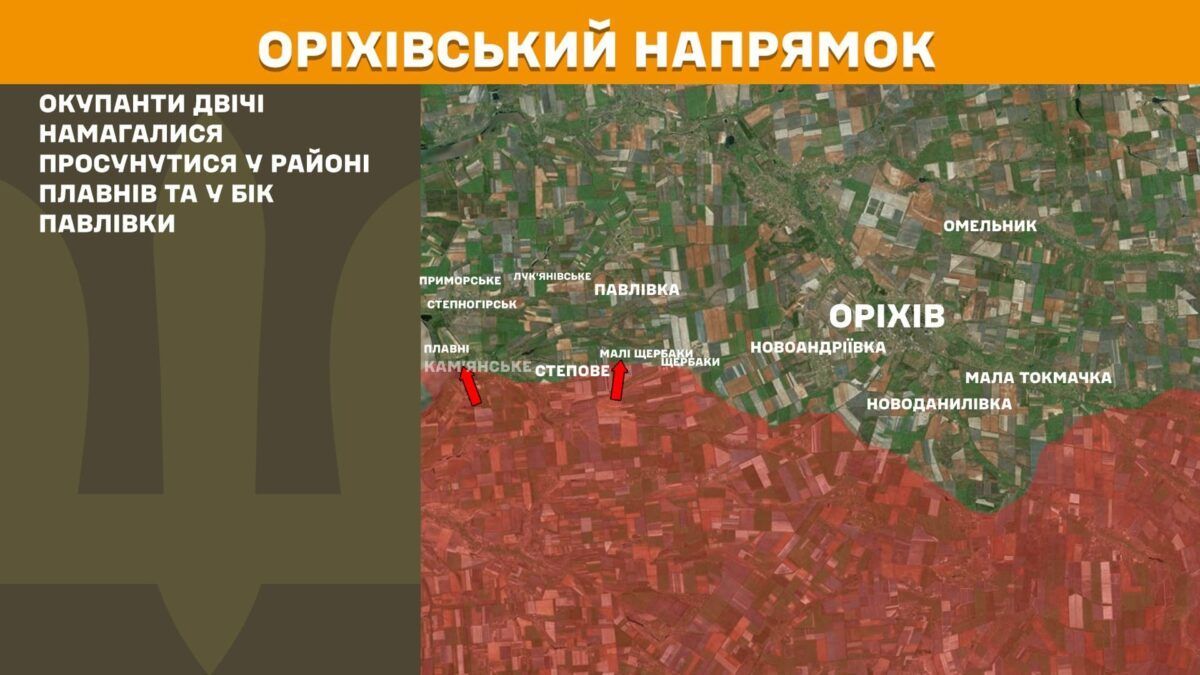 На Оріхівському напрямку ворог двічі спробував просунутися у районі Плавнів та у бік Павлівки.