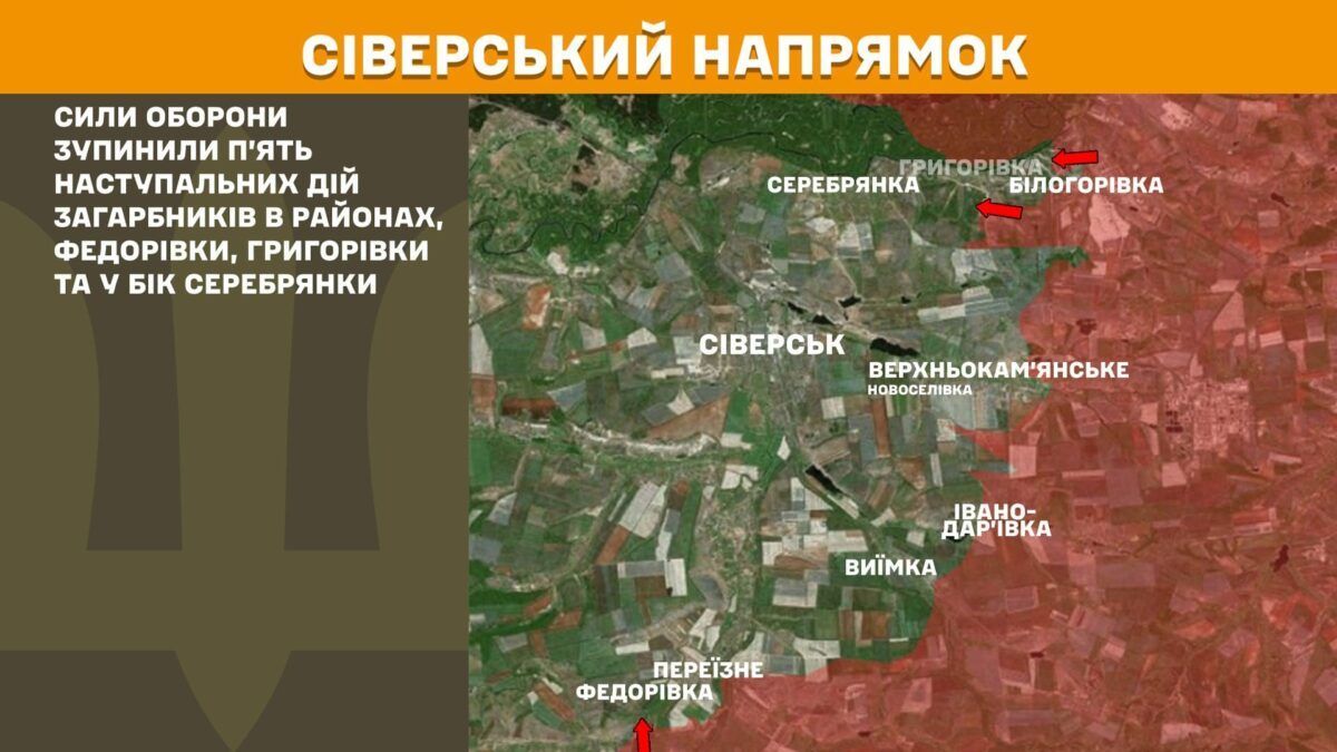 На Сіверському напрямку зупинено п’ять штурмів у районах Федорівки, Григорівки та у бік Серебрянки.