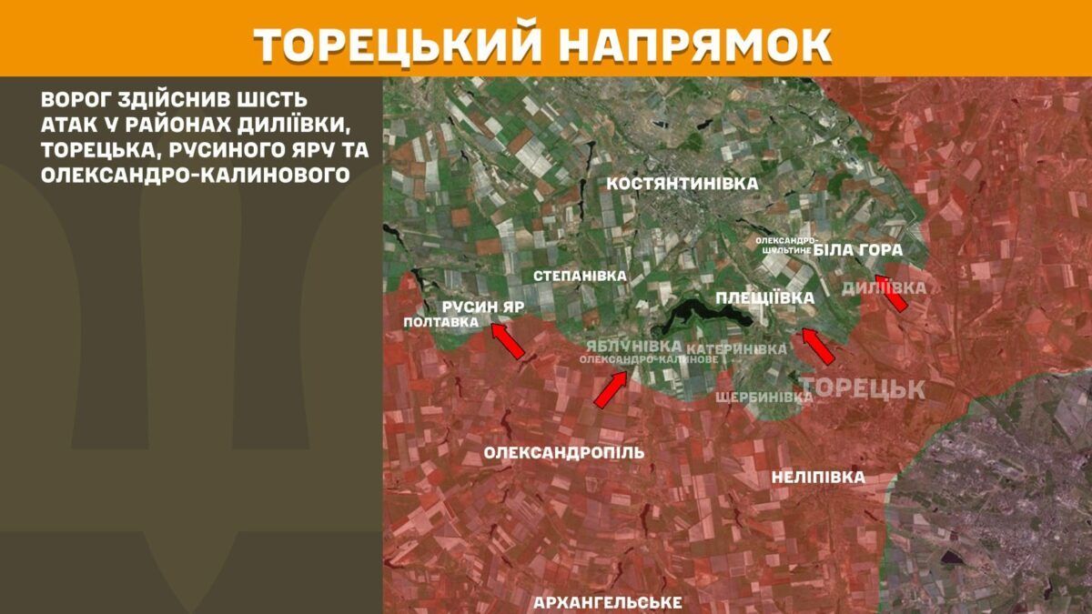 На Торецькому напрямку відбулося шість атак у районах Диліївки, Торецька, Русиного Яру та Олександро-Калинового.