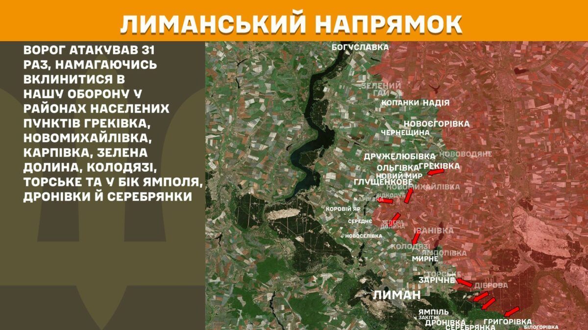 На Лиманському напрямку ворог атакував 31 раз, намагаючись вклинитися в нашу оборону у районах населених пунктів Греківка, Новомихайлівка, Карпівка, Зелена Долина, Колодязі, Торське та у бік Ямполя, Дронівки й Серебрянки.