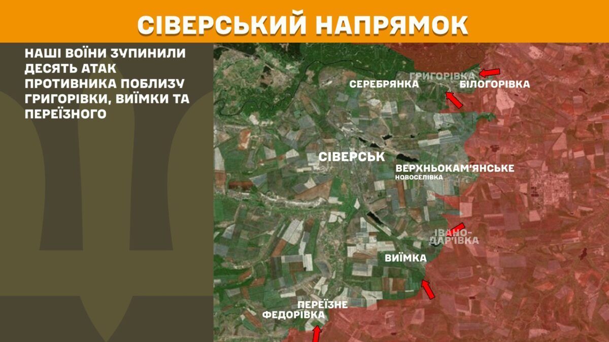 На Сіверському напрямку наші воїни зупинили десять атак противника поблизу Григорівки, Виїмки та Переїзного.