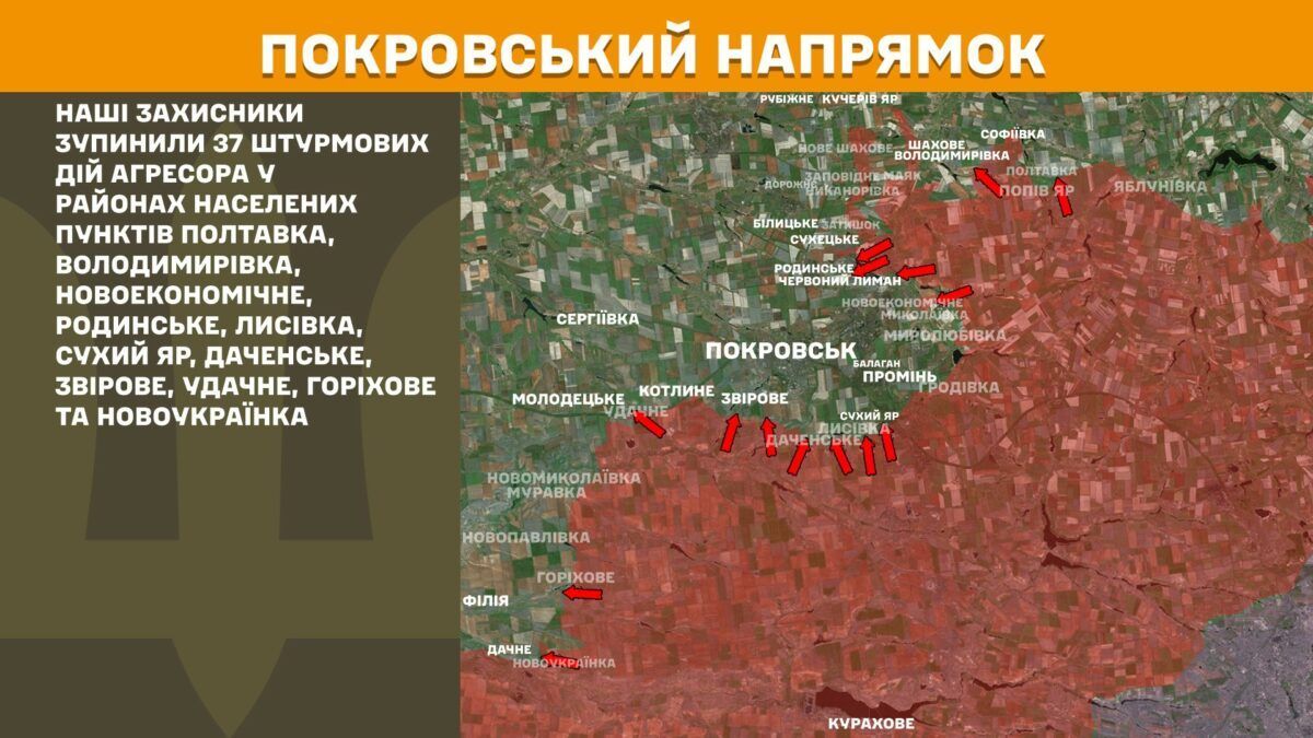 На Покровському напрямку наші захисники зупинили 37 штурмових дій агресора у районах населених пунктів Полтавка, Володимирівка, Новоекономічне, Родинське, Лисівка, Сухий Яр, Даченське, Звірове, Удачне, Горіхове та Новоукраїнка.