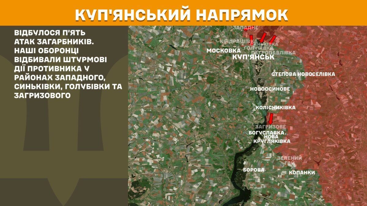 На Куп’янському напрямку вчора відбулося п’ять атак загарбників. Наші оборонці відбивали штурмові дії противника у районах Западного, Синьківки, Голубівки та Загризового.