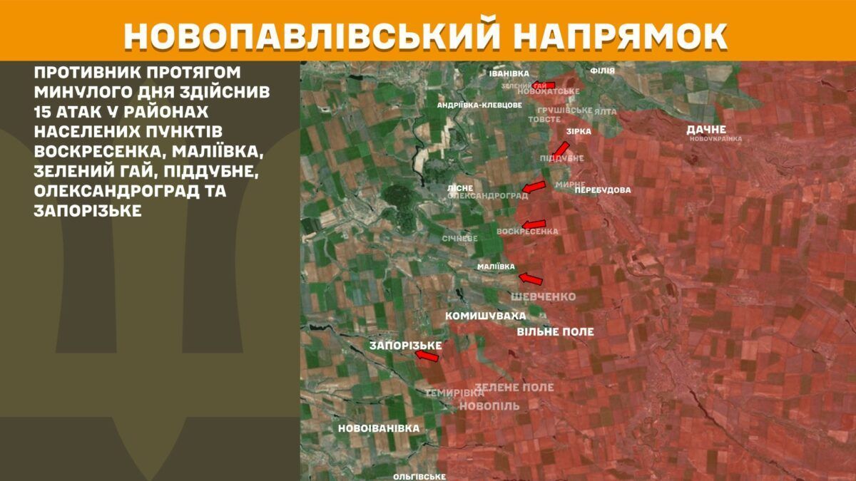 На Новопавлівському напрямку противник протягом минулого дня здійснив 15 атак у районах населених пунктів Воскресенка, Маліївка, Зелений Гай, Піддубне, Олександроград та Запорізьке.