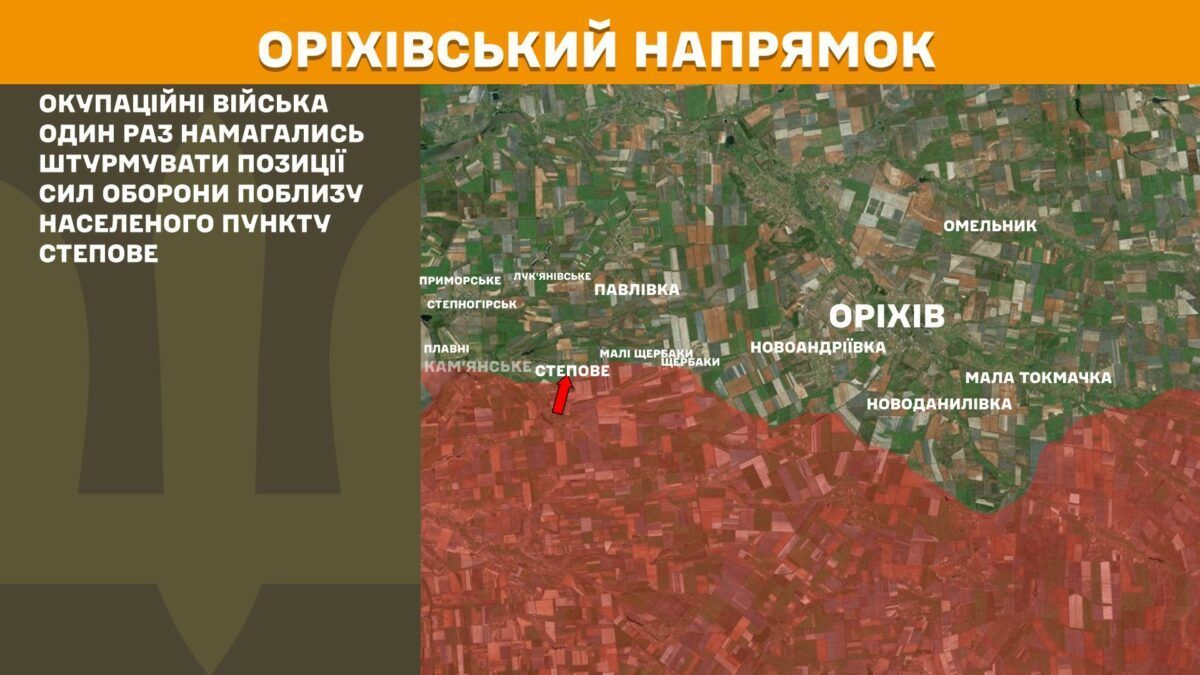 На Оріхівському напрямку окупаційні війська один раз намагались штурмувати позиції Сил оборони поблизу населеного пункту Степове.